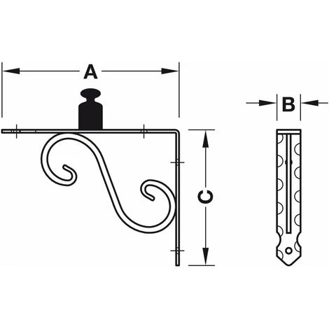 2x Equerre console rigide ; Matière = Acier forgé ; Finition = Noir antique ; Dimension A = 150mm ; Dimension B = 20mm ; Dimension C = 115mm ; Capacité de charge par pièce = 15kg (testé selon DIN EN 16337:2013-08, avec plaque de choc 1,7 kg) ; La capacité de charge indiquée n’est valable que pour une charge répartie uniformément (charge de surface) et une fixation conforme et fiable au mur ; Distance maximale entre 2 consoles = 700mm