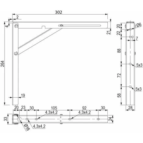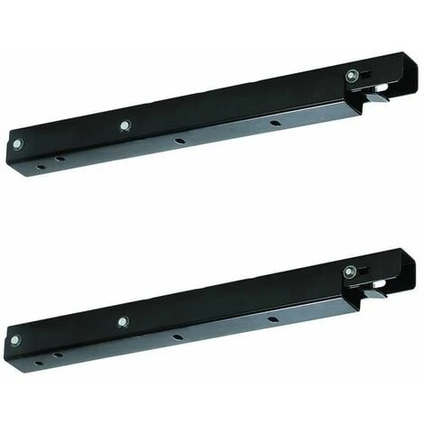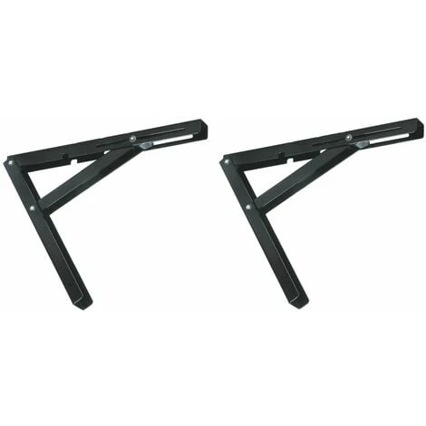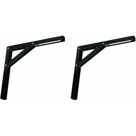 2x Equerre pliante ; Matière = Acier ; Couleur = Noir ; Hauteur = 264mm ; Longueur d’épaule = 300mm ; Capacité de charge = 100kg par paire ; Distance entre l’étagère et le mur lorsqu’elle est complètement pliée = 30mm ; Se verrouille à 90° ; Répond aux certificats de sécurité et d’endurance PN-EN 12521 : 2009 et PN-EN 15372 : 2010 ; Robuste, pliable et décorative ; Idéal pour les étagères pliantes, les petites tables …