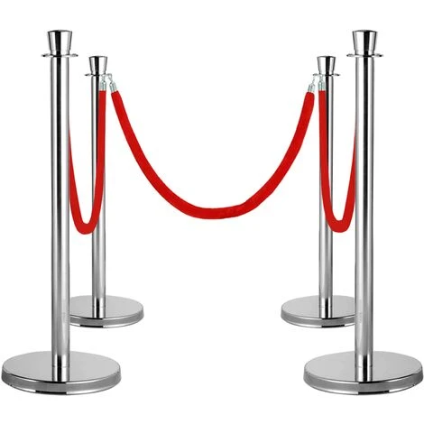 Lot de 4 poteaux de balisage et 3 cordons de guidage en velour rouge. Aménagez votre commerce ou votre événement avec ces potelets de guidage. Créez des files d’attentes qui conviendront parfaitement à vos besoins et qui permettront le contrôle de foule. Chaque poteau peut accueillir plusieurs cordons de séparation pour créer les files d’attente adaptée. Simples et rapides d’installation, moins de 5 minutes suffisent pour créer et délimiter votre chemin d’accès ou votre file d’attente. Spécialement conçus pour le guidage des foules, les poteaux de guidage sont équipés d’un socle de 6 kg en ciment et de 4 encoches pour les cordons. Les poteaux de guidage Inox peuvent être utilisés aussi bien en extérieur qu’en intérieur. La qualité professionnelle des poteaux vous permettra de sécuriser votre zone d’attente et ainsi éviter tout risque de débordements. Ils seront indispensables pour l’organisation de vos événements.