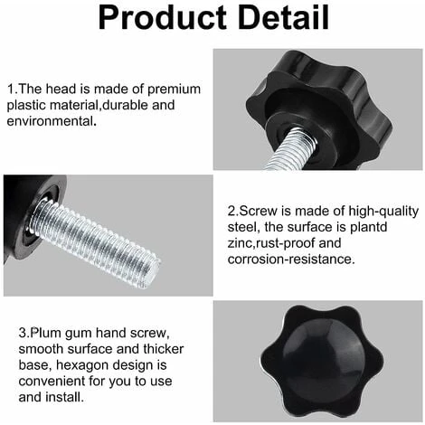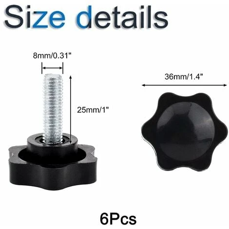 [STAR HEAD DURABLES]- tête étoile est faite de plastique de haute qualité, une bonne ténacité et de résistance aux chocs et durable. [Antirouille Vis ]- Vis sont en fer de haute qualité, surface galvanisée, haute dureté, résistant à la rouille, robuste et durable. [FACILE À UTILISER]- Grande poignée moletée en plastique pour une prise confortable, vis entièrement filetée pour faciliter l’installation, le retrait et le réglage. [WIDE APPLICATION]- Ces vis à oreilles sont largement utilisées pour les équipements mécaniques, les équipements électroniques, les équipements de communication, le matériel informatique, la décoration de meubles et d’autres industries connexes. [PAQUET DE 6]- Chaque paquet comprend 6 vis à tête moletée M8 * 25mm. Longueur du filetage: 25 mm; Diamètre du filetage: M8, filetage métrique.Détails sur le produit