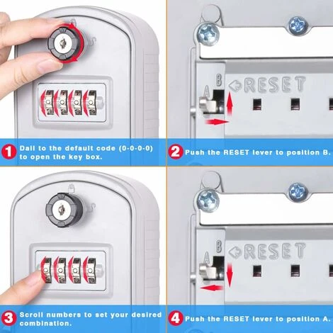 【Réinitialiser le code et trouver le code】Le code de la boîte à clés d’origine est 0-0-0-0, si vous souhaitez réinitialiser le code, ouvrez la boîte et placez le bouton A sur B (comme le montre l’image), faites défiler les chiffres pour définir la combinaison souhaitée, puis mettez le bouton B sur A, c’est ok. (Remarque : si vous avez oublié le code, utilisez d’abord la clé de rechange pour l’ouvrir, puis faites défiler 4 chiffres jusqu’à ce que vous voyiez la COULEUR ROUGE au dos de la clé)