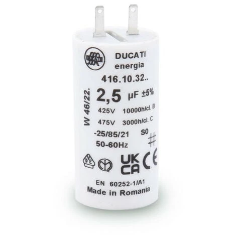 En achetant ce produit, vous obtiendrez un condensateur DUCATI 2,5 uF (microfarrad) de tolérance 5% 450 V AC pour une utilisation de 10 000 heures estimée. CE