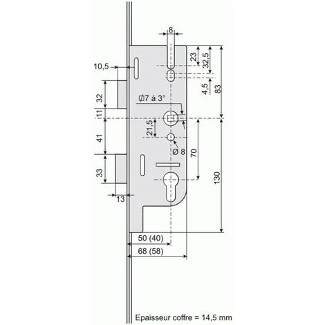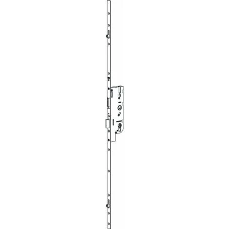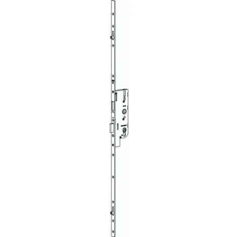 2 galets réglables Ø 11 mm, hauteur 9 mm, course 18 mm, 1 pêne demi-tour sortie 10 mm et 1 pêne dormant central sortie 13 mm.