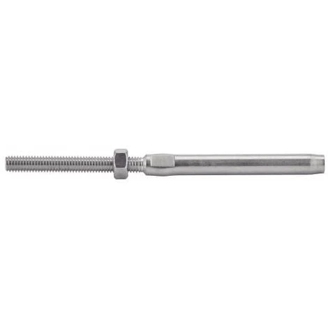 Cette terminaison à sertir directement sur un câble inox, comprend une tige filetée en pas à droite avec un écrou.