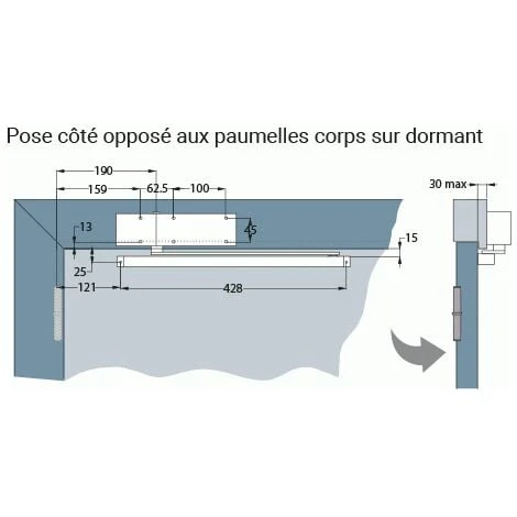 - Permet un montage côté et opposé aux paumelles. Réversible droite et gauche.
