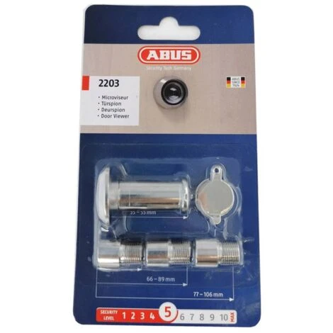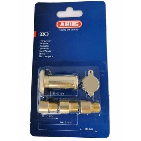 Judas Abus permettant de voir avec précision devant votre porte. Diamètre 14 mm Très grand angle de 200 degrés permettant de voir jusqu’au palier. Même une personne accroupie ou sur le côté ne pourra pas vous échapper. Installation très simple et rapide. Percez simplement la porte et vissez les différents éléments pour obtenir la longueur souhaitée. Judas compatible sur toutes les portes avec épaisseur comprise entre 35 mm et 106 mm. Vendu avec un petit cache à installer côté intérieur du logement. Disponible en 2 couleurs : Doré ou Argenté.