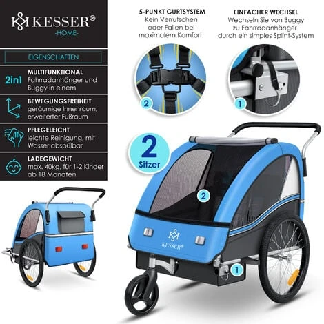 KESSER Remorque pour enfants Sport-RX 2in1 utilisable comme remorque de vélo et poussette, intérieur spacieux et espace pour les pieds élargi, nettoyage facile par rinçage à l’eau, poids de charge max. 40 kg pour 1-2 enfants à partir de 18 moisSûr, plus rapide et meilleur
