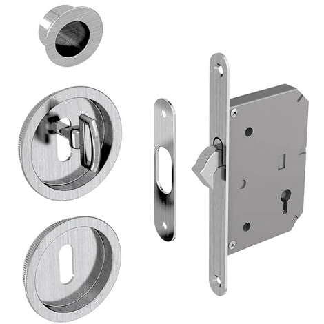 Serrure à crochet à encastrer avec poignées rondes et tire-doigt pour porte coulissante.