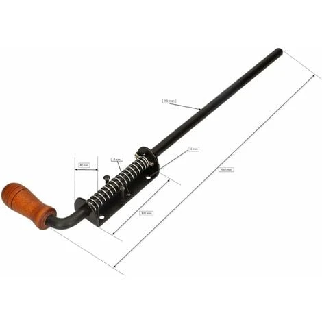 - Caractéristiques techniques – Matériau : métal avec revêtement en poudre – Longueur totale de la barre à ressort : 470 mm – Boulon : 14 mm – Longueur du boulon : 480 mm – Longueur de la plaque : 120 mm – Largeur de la plaque : 40 mm – Trou : 2 x 4 mm et 4 x 6 mm – Poids : 854 g – Poignée en bois laqué