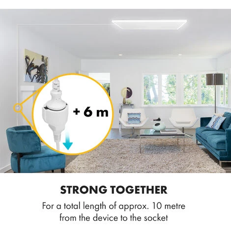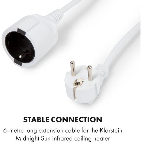 Le câble de rallonge de 6 mètres permet d’alimenter confortablement le radiateur infrarouge de plafond Klarstein Midnight Sun et offre une longueur totale d’environ 10 mètres de l’appareil à la prise.