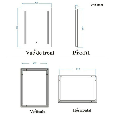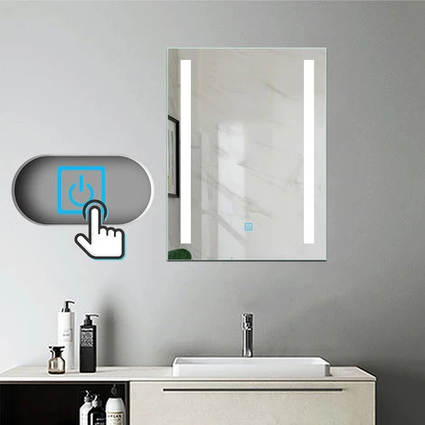 - Dimensions:60x45cm,miroir épaisseur:4mm,assure la durabilité et le système antibue augmente la visibilit, vite d’essuyer et est très utile pour des salles de bains mal ventiles ou sans fentre. Il amliore d’autant plus la visibilit et vite d’attendre que les vapeurs se dissipent.