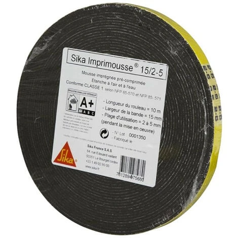 Cettemousse polyuréthanne SIKA pré-comprimée Imprimousse est spécialement conçue pour être comprimée dans le joint entre deux éléments afin d’en assurer l’étanchéité à l’air et à l’eau. Sa pose est facile et rapide et ne nécessite aucun outil. Elle confère une excellente isolation phonique et thermique et une très bonne résistance aux UV et aux intempéries.