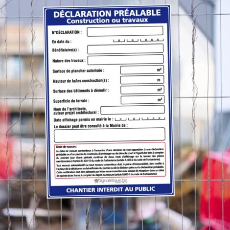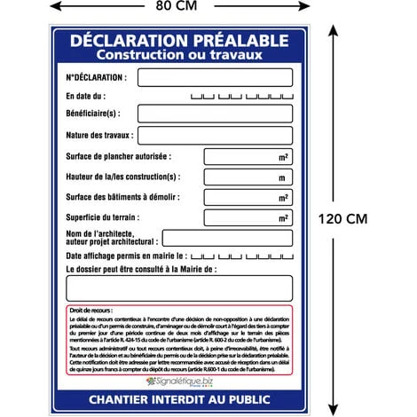 Dimensions de votre panneau Déclaration préalable Construction ou travaux : 80 x 120 cm.