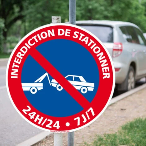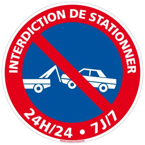 Ce panneau classique d’interdiction de stationner comporte la mention au bas 24H/24 . 7J/7, signifiant que l’interdiction de stationner s’applique à n’importe quel moment.