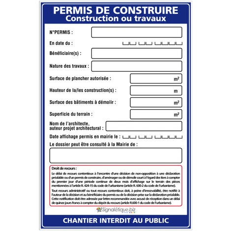 Après obtention de votre permis de construire et avant de débuter les travaux, il est impératif de placer un affichage obligatoire de déclaration de permis de construire devant le chantier. Notre panneau permis de construire construction ou travaux est donc idéal pour respecter la Loi. Il permet notamment de renseigner le N° du permis, la date de délivrance, le bénéficiaire, la nature de vos travaux, la superficie hors d’œuvre, la hauteur… dans les encarts de personnalisation grâce au marqueur noir fourni. Ainsi, vous êtes couvert en cas de problème.