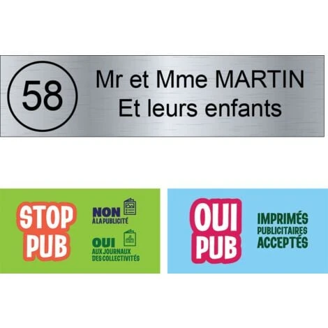 Plaque de boite aux lettres avec numéro personnalisée au format 100 x 25 mm de couleur argent écriture noire. 2 lignes de texte, choix de 12 polices de caractères.