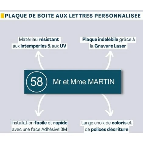 Plaque de 100 x 25 mm et d’une épaisseur de 1.6 mm avec adhésif 3M pour une adhérence parfaite sur surface lisse. Peut également être insérée dans la fenêtre de la boite. La plaque est très simple et rapide à installer.