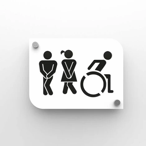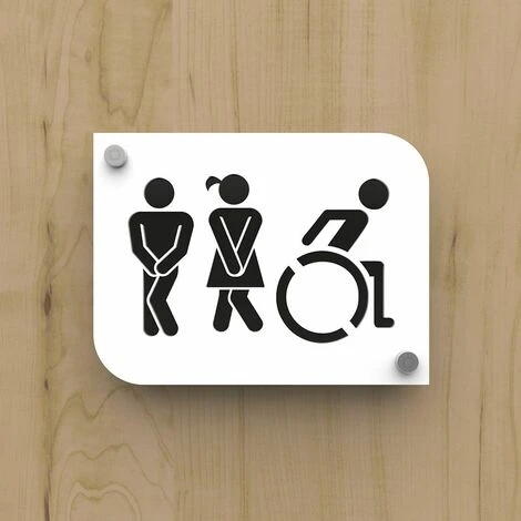 Optez pour un pictogramme / plaque de porte doté d’un trio de silhouettes design hommes / femmes / handicapés pour indiquer l’emplacement et l’accessibilité des toilettes au sein de votre entreprise, bureaux, salle d’attente, hôtel, restaurant.