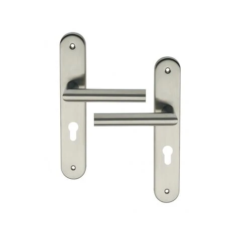 Garniture de porte d’entrée sur plaque complète – ensemble de 2 poignées de porte – en alu finition inox, fonction Clé I pour cylindre de serrure.