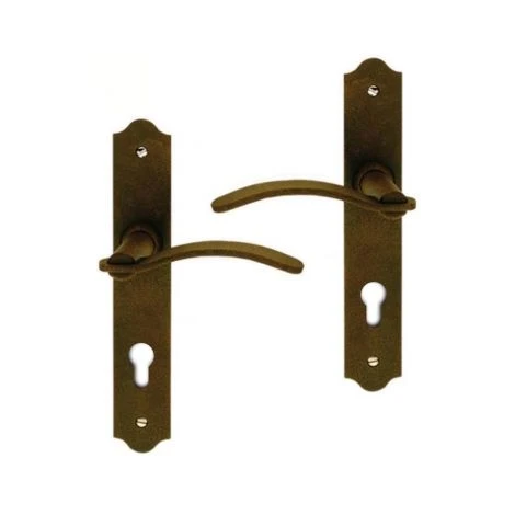 Garniture sur plaque ou ensemble de 2 poignées de porte en fer finition rouillé fonction Clé I pour cylindre de serrure.