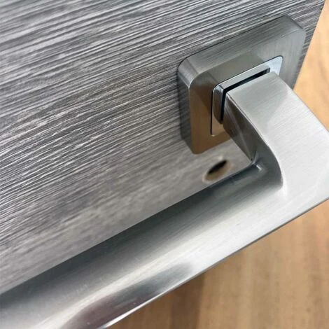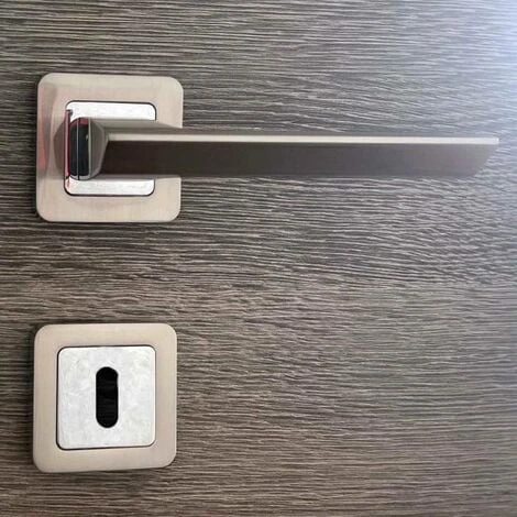 Paire de poignées de porte chromées et satinées sur rosaces carrées au bouts arrondis