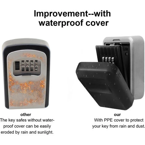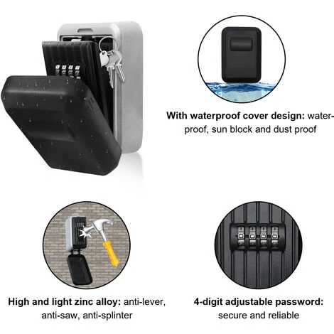 Avec le coffre à clés verrouillable et résistant aux intempéries ,Cela permet de protéger la serrure à la fois de la saleté, de la pluie, du vent et de la neige. Ainsi, la boîte à clés avec code est le lieu de rangement idéal pour déposer vos clés proprement, au sec et en toute sécurité.