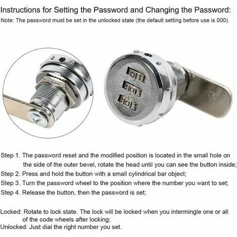 【Serrure d’armoire Réglage】Le mot de passe initial pour le verrouillage de code est 000 et il existe 1000 combinaisons de mots de passe. Vous pouvez changer le mot de passe vous-même. Vous n’avez pas besoin d’installer de vis pour installer le verrou