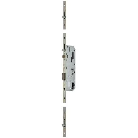 En acier zingué. Coffre de : 210 x 70 x 13 mm (axe à 50 mm) ou 210 x 60 x 13 mm (axe à 40 mm). Têtière de 2150 x 18 x 2,5 mm recoupable. Fouillot de 7 mm, axe à 1045 mm du sol. Entraxe : 70 mm. Condamnation des 3 points de verrouillage par la béquille ou par claquement de la porte. Relèvement possible de la poignée à 90° permettant l’ouverture d’un châssis vitré. Pêne dormant en acier, à 1 tour de clé. Descente forcée des galets par relevage de la béquille. Rouleaux réglables. Main universelle.