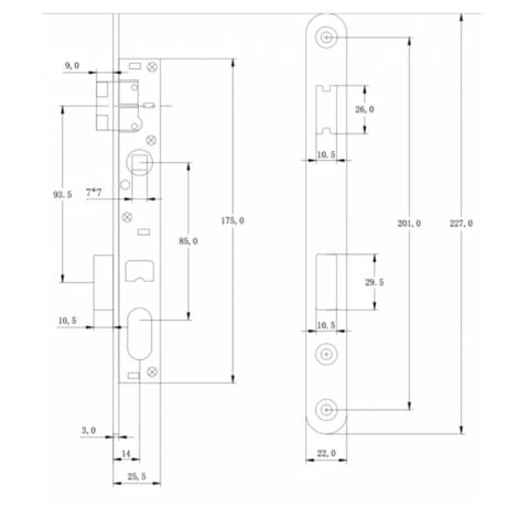 Sûreté à encastrer pour cylindre oblongue et faible épaisseur de montant + gâche