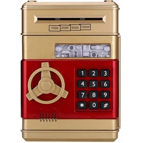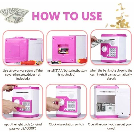 Tirelire Coffre-fort avec mot de passe : entrez les 4 mots de passe d’origine (par défaut : 0000, mots de passe changeables comme vous le souhaitez), la lumière verte s’allume, le ATM peut être ouvert. Si vous saisissez le mauvais mot de passe, la lumière rouge s’allume et le son de « Veuillez essayer à nouveau » vous invite de ne pas l’ouvrir, si le mot de passe est incorrect)