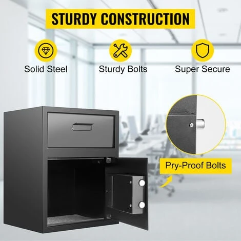 - Construction Durable : Ce coffre-fort de depot est construit en acier au carbone robuste avec une porte avant et un corps epaissis, qui peuvent resister a limpact des mains et des outils mecaniques. Des boulons et des charnieres robustes ameliorent ses performances antivol.