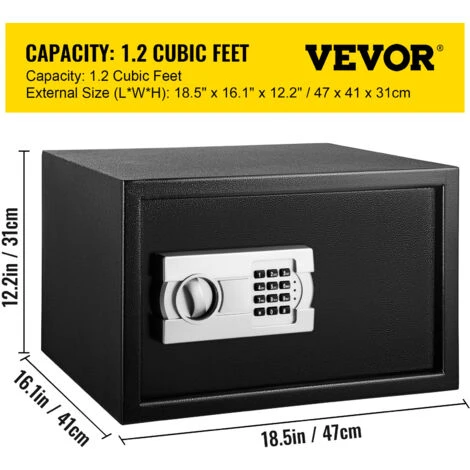 Taille interne (L x l x H) : 42,7 x 30,9 x 26,7 cm. Son espace de stockage de 34 L / 1,2 pieds cubes est pratique pour ranger de largent, un appareil photo, des documents, une montre, de petits ordinateurs portables, des bijoux, etc. Un coffre-fort peut repondre a tous vos besoins quotidiens besoins de stockage.