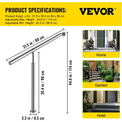 - Main Courante Flexible pour 1-2 Marches : La main courante de 80 cm de long et de 90 cm de haut est parfaite pour les escaliers exterieurs de 1-2 marches. L’angle de transition 0-90° permet de regler la hauteur entre le haut de la main courante et le sol (86,8-114 cm) pour sadapter aux escaliers ou aux porches. La rampe deescalier se compose deun support de rampe superieur et deun pilier en tube deacier, assurant lequilibre lorsque vos familles montent et descendent.